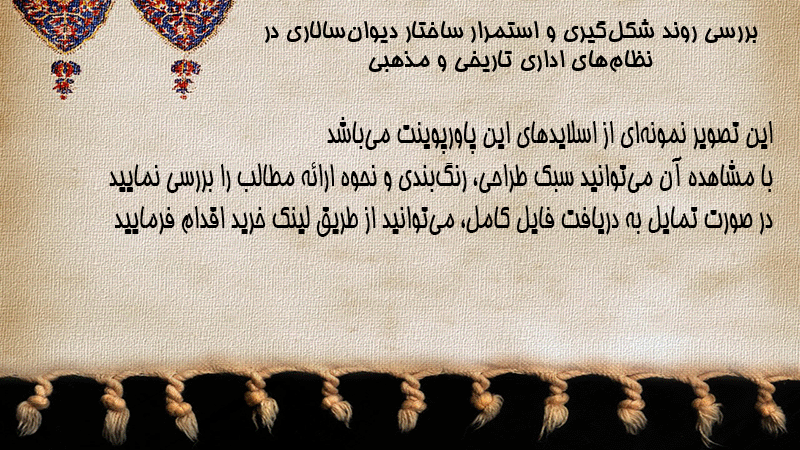 پاورپوینت بررسی روند شکلگیری و استمرار ساختار دیوانسالاری در نظامهای اداری تاریخی و مذهبی
